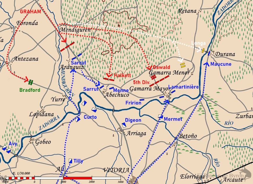 «La columna de la izquierda, la columna de Thomas Graham, se desplazará desde Murguia por la carretera que desde ese lugar conduce a Vitoria. [Murguia muy lejos en esa dirección, hacia el noroeste]. El teniente general Sir Thomas Graham se pondrá en comunicación lo antes posible con la columna central izquierda desde la que también se enviarán todos los destacamentos para que alcancen los Huetos para facilitar sus comunicaciones. [Los Huetos son dos pueblos que están al norte de Mendoza, la torre en la que estábamos. Están más allá, hacia el norte.] La columna bajo el mando del conde de Dalhousie y la de sir Thomas Graham regularán sus movimientos por los de las dos columnas del ejército de la derecha, cuyo avance se esforzarán en facilitar.«