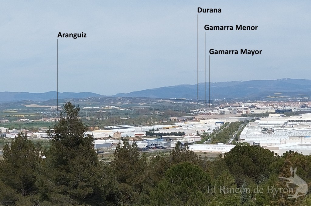 La pista de aterrizaje (el aeropuerto de Vitoria), viene hacia nosotros y luego mira a la izquierda. Está al final de la pista de aterrizaje. Sí, al final de la pista de aterrizaje son las 9 en punto. La iglesia en la cima de la colina (la iglesia de San Andrés). Es el pueblo de Estarrona.