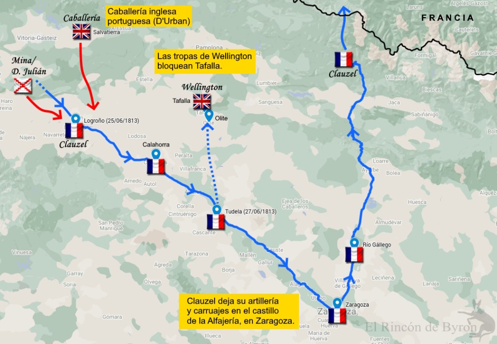 Retomando nuestra historia, estuvimos en Vitoria y hablamos de la huida del ejército francés. ¿Qué fue lo que le pasó al ejército francés? Bien fuera de esta batalla, los franceses habían enviado la división de Maucune al norte, también más al norte estaba la división del General Foy. Al sureste, había candidatos para llegar al campo de batalla también con tres divisiones al mando del general Clauzel, que no lograron llegar al campo de batalla. Venía del sureste de Logroño cuando recibe la noticia de la derrota de Vitoria. Así que da media vuelta e intenta llegar, gira de nuevo hacia el sureste e intenta avanzar hacia el norte, hacia Pamplona, pero el ejército de Wellington están avanzando a lo largo del valle.