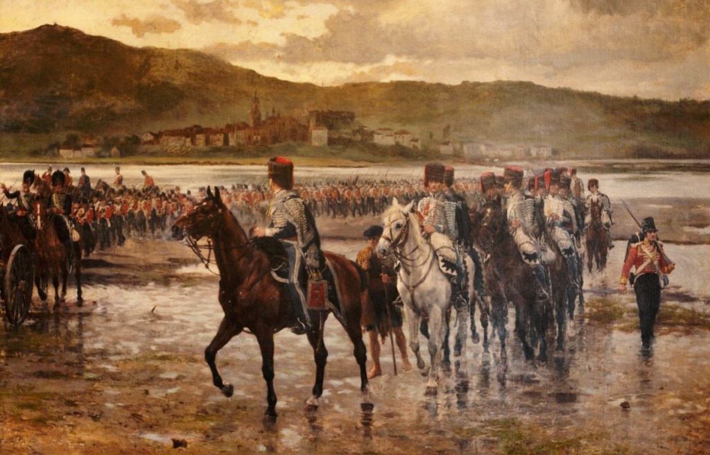 Y lo que tienen aquí son los húsares, para responder a su pregunta, son los Húsares, justo al otro lado, el oficial de húsares con sus hombres detrás de él, y detrás de ellos se ve la marcha de la 5ª División, está echando un último vistazo a España, y al fondo se puede ver la iglesia de Fuenterrabía6, entonces la vista de las pinturas de Beadle está en algún lugar de esa zona de agua allí, así que pueden ver esa pintura, esa era la vista que hubieran tenido aquí.