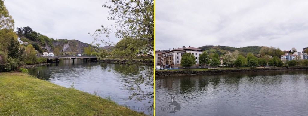 Acabando de llegar de Fuenterrabia, este es el mismo río Bidasoa y fluye según lo miramos. Empiezo a ver cómo corta la roca allí. Parte de eso, pero parte es río natural. Pero a partir de este momento, este es el punto oriental de Fuenterrabia. A partir de este punto, es el lado oeste de Fuenterrabia. Y de este lado está el pueblo de Behobia, de ese lado, es el pueblo de Biriatu. Biriatu, luego está Irún, el resto y, por supuesto, el río natural.