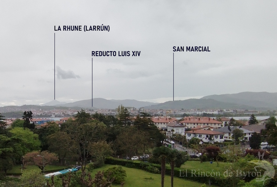 Entonces, si siguen la línea del cerro de San Marcial hacia abajo, es a la izquierda y al flanco, luego se encontrarán con un bosquecillo, una zona boscosa, y luego podrán ver algunos edificios de gran altura llenando el hueco, y luego hay algunas colinas bajas más allá arriba, y en la cima de esa colina baja, justo debajo de la colina grande, ¿lo pueden ver todos? Si siguen donde estoy, hay un edificio con techo rojo, y hay como un rectángulo blanco en la parte superior, verán eso, y luego la colina inmediatamente a esa izquierda, debajo del horizonte, una elevación baja allí, ese es el reducto de Luis XIV, y frente a ese reducto de Luis XIV está la carretera principal hacia Francia, así que tienen esas alturas boscosas que cruzan de derecha a izquierda en el lado opuesto, que culminan en esa Radio Massimo que está parpadeando frente a nosotros.