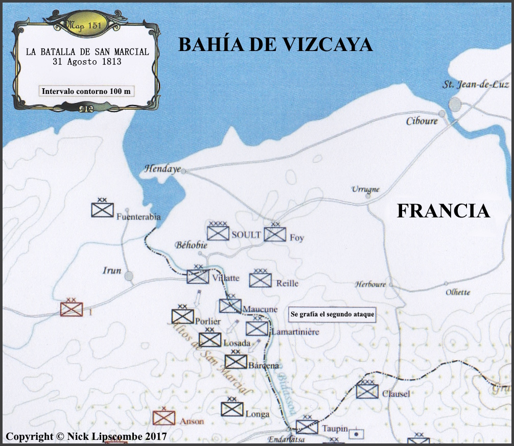 Aquí tiene lugar el flanco derecho, y el objetivo es la fuerza española que se encuentra en lo alto de la colina de San Marcial. Hay tres divisiones españolas situadas allí arriba, y hay divisiones españolas en ambos flancos. Se trata de un ataque puramente contra los españoles, conocido como la batalla de San Marcial.
