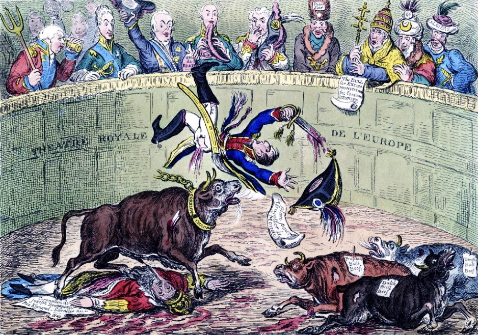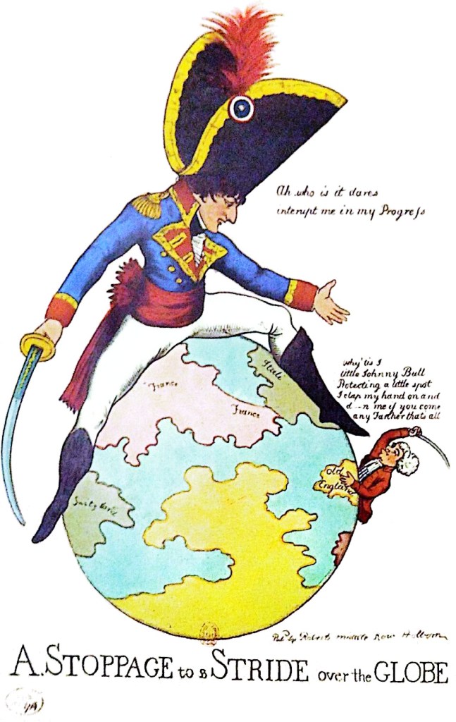 Esta caricatura, publicada en la prensa inglesa de la época muestra a Napoleón montado a horcajadas sobre el mundo a punto de castigar con el bloqueo continental a Inglaterra, de donde sale un hombrecillo que le conmina a detenerse.