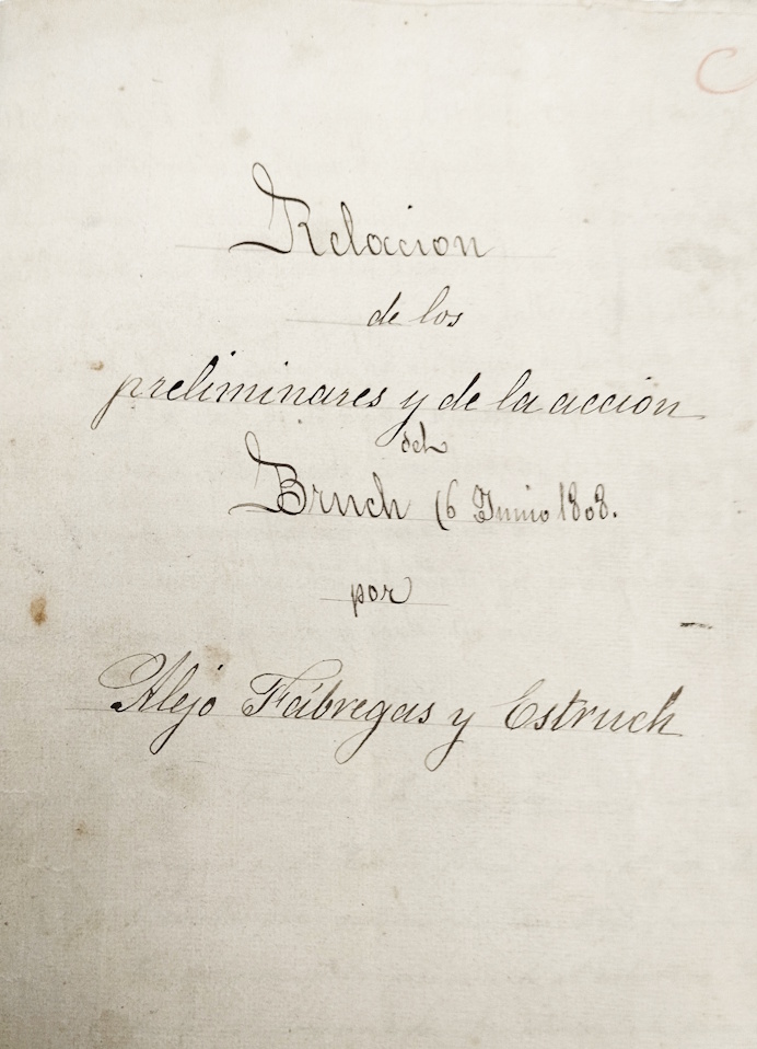 1 – «Relación de los preliminares y de la acción del Bruch (6 de junio de 1808)» – por Alejo Fábregas y Estruch, Manuscrito con fecha 06/02/1887, Arxiu Comarcal de l’Anoia.