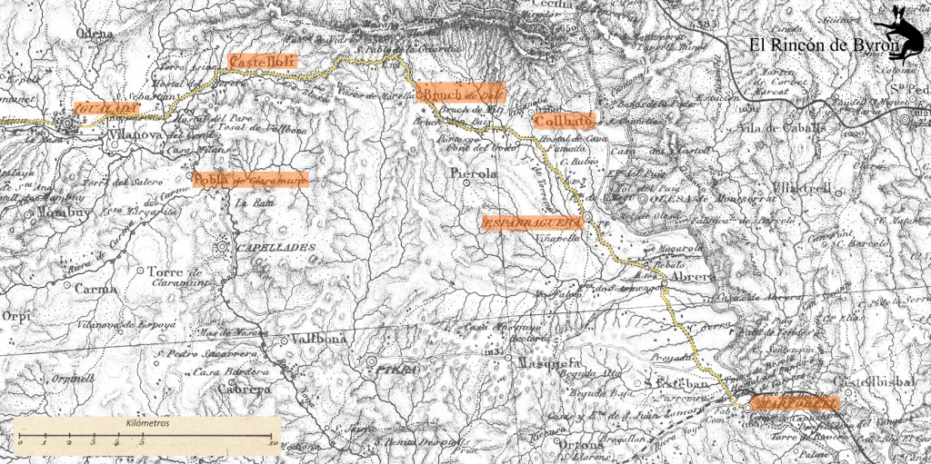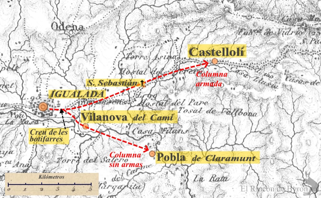 El toque de somaten de Ygualada fue el 1º y enseñera de toda la comarca. El pueblo amotinado, el Ayuntamiento y junta en sesion permanente por los exagerados rumores de espanto y desolación que habian cundido y la llegada de unos pocos soldados (sobre 8 o 10) dispersos y fugitivos de Barcelona naturalmente temerosos y azorados hizo que los rumores tomasen proporciones fantasticas y que no se aguardara la contestacion o armas que debia de traer de Villafranca la Comision de la que con su delirio y fogoso entusiasmo ni siquiera debieron acordarse en el primer momento. A fin sin duda de ganar tiempo, armandose como pudieron y en tropel sin mas guia ni Gefe que su entusiasmo y valor salieron por la puerta de la Soledad. Al llegar al punto conocido por creu de las butifarras7 algunos de los que iban sin armamento ó con malas armas se separaron del somaten diciendo les aguardasen en las llanuras de Castellolí pues que ellos iban por Vilanova y la Pobla a fin de aguardar la Comision que no debia tardar de su regreso de Villafranca atendidas las circunstancias, tiempo y movimiento del pais, y de encontrarla no solo se adquiririan nuevas y fidedignas noticias sino que tendrian canedillo(?), armamento y mayor numero de gente para combatir.