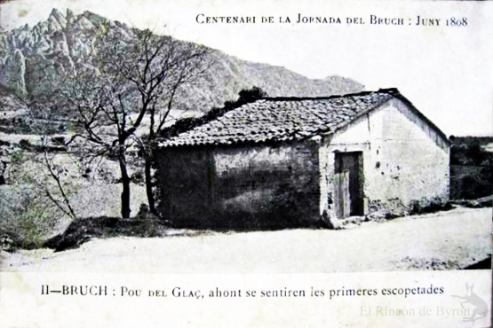 Varias fuentes coinciden en que las primeras escaramuzas de la jornada se dieron a varios kilómetros de distancia de nuestro relato inicial. La columna francesa avanzaba desde Collbató precedida por una pequeña vanguardia, formada por el 3º Provisional de Coraceros, ajenos a cualquier posible peligro. Al acercarse a Bruch de Baix, cerca del Pou del Glaç (Pozo de Hielo), recibieron disparos de mosquete de 8 somatenes en la casa de D. Emilio Pascual, estos fueron en realidad los primeros disparos realizados contra los franceses. [8]