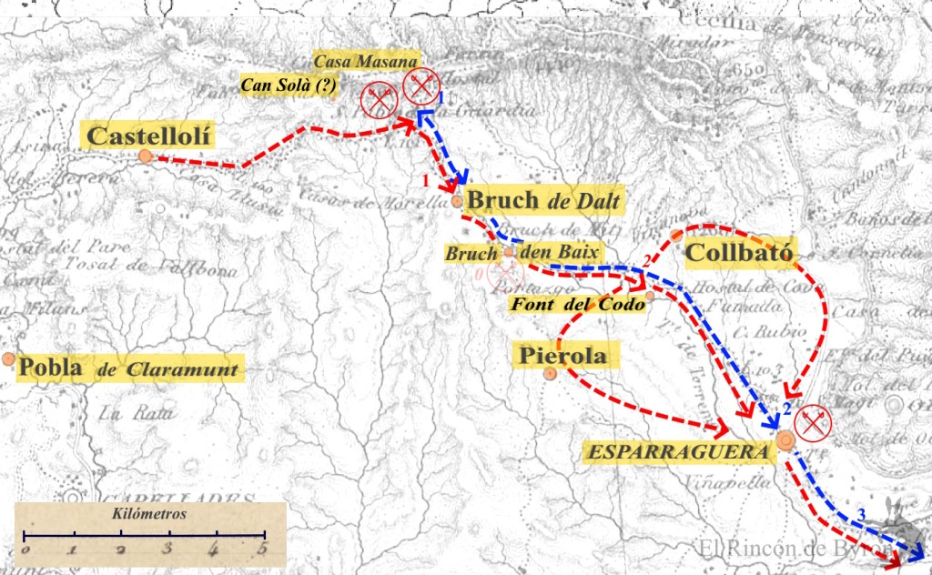 El ejercito francés tuvo por precision que hacer alto por unos momentos à la entrada de Esparraguera con motivo de haber obstruido la calle aquellos vecinos con bancos, sillas, mesas, calderos y otros utensilios que habian hechado sobre los primeros franceses (vanguardia) que retrocedieron del Bruch.