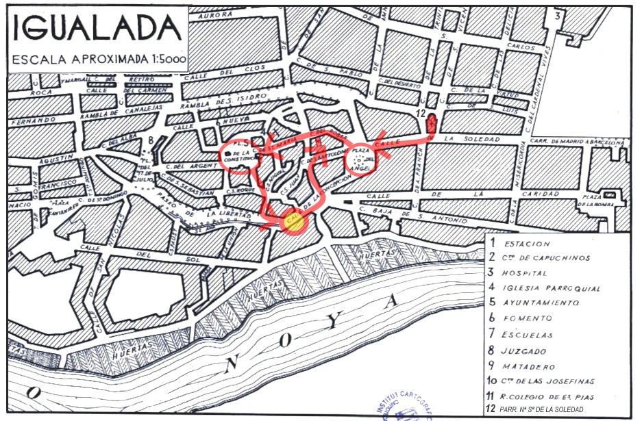 A las 5 de la mañana y saliendo de la capilla de Nuestra Senyora de la Soledad situada en la calle del mismo nombre una muger apodada Xandrià vió que subia calle arriba un tal Juliá y cogiendo piedras dirijióse al portal de su casa y a su pasó le dijo «Que tal Juliá mucho debe haber andado esta noche pues de fijo habrán vuelto ya del Montjuich» a lo que contestó ser falso. Entablaronse de palabras la muger le apostrofó al espia de los franceses, tirándole las piedras que tenia en la mano. Subia por dicha calle y en aquellos instantes un tal Micaló de casa Majoras de Vilanova del Cami aseverando lo dicho por la muger y juntos siguieron al Juliá. Al llegar a la Plaza del Angel se les unió otro sugeto apodado Cuent uniendo su voz a los gritos, denuestos e imprecaciones de la Xandrià y de Micaló contra Juliá. Al poco fue reuniendose gente y mas gente hubo el consiguiente alboroto lo que motivó el comienzo del toque de arrebato. El pueblo amotinado siguió la pista de Juliá quien temeroso se había refugiado debajo las cubas de la taberna que existia en aquel entonces en la plaza del Blat (Constitucion) conocida por taberna del Josepó Vilaseca sita en la hoy casa propiedad de Manuel Bertran comerciante en espiritus y aguardientes. El dueño del establecimiento temiendo las iras y amenazas del pueblo hizo salir a Juliá quien desnudado tembloroso y azorado emprendió precipitada fuga por debajo de los porticos, voltas de las carnicerias, pescateria y callejon de Gracia en direccion al rio Noya y costa del Meseguer. Al llegar á la hilera de moreras que habia al extremo del Paseig de las cabras Paseo de la Princesa conocida por filada de las moreras dels corders hoy calle de la Concepcion y en el terreno que en la actualidad ocupa la casa del celebrado homeópata Rdo. P. Mariano Ferrer y Estruch fue derribado Juliá de una pedrada al cogote. El pueblo alborotado queria darle muerte alli mismo y sin duda lo hubiera efectuado a no oponerse de un modo valeroso y energico el vicario de la parroquia de Sta. Maria Mosen Matias quien haciendose cargo del herido lo hizo trasladar al Hospital junto a la capilla de S. Bartolome dando encargo a los guardianes que nadie absolutamente le diera cosa alguna ni se le acercara para nada pues era de la sexta malvada y un esperitat5. Cumpliendo dicha orden fué rechazada la vecina de Juliá (criada de la casa de D. Francisco Raurés Notario) llamada Rosa que compadecida del herido le llevaba una taza de caldo. Permaneció Juliá en dicho Santo asilo dos dias. El 8 del propio mes y año llegó a Igualada el somaten de Cervera y enterado de lo sucedido sacó de la enfermería a Juliá y al pasar por frente al cuartel conocido por Pabellons un individuo de aquel somaten apodado Escurcheta empezó a dar al herido golpes y hachazos con encarnizamiento, lo que dió lugar a que removiendose el odio de las masas populares que estas con saña inaudita hicieran mil pedazos de Juliá y recogido en una mala estera iban a enterrarlo en el muladar6 del rio. Enterado el Rdo. Matias se opuso disponiendo fueran llevados al cementerio de la villa en donde se le dió cristiana sepultura.
