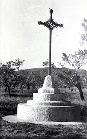 7El 7 de junio de 1411, la villa dio licencia para cambiar la vieja cruz [NT: de término] situada en el camino del monasterio de Montserrat. Esta cruz desapareció a mediados del siglo XVIII. En 1867 el párroco Dr. Ramon Sala pidió el consentimiento al ayuntamiento para restablecerla en el cruce entre el camino real y el camino al cementerio (actualmente Av. Caresmar/Pau Casals) y la carretera de Vilanova. En 1935 cuando se propuso hacer una plaza en el lugar donde estaba emplazada, la familia Recassens solicitó el traslado a su torre, en el jardín. Derribada en 1939 y restaurada en 1940. Se conoce por la cruz de las butifarras (creu de les butifarres), ya que su primera localización estaba situada junto a los Burots. [5] (Es como se denomina en lengua catalana la oficina o caseta en la entrada de una población donde un funcionario municipal se encargaba de cobrar los derechos de entrada de ciertos artículos.)