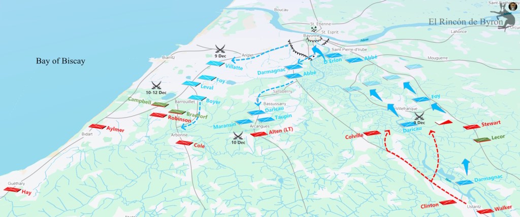 Al mismo tiempo, Sir John Hope, que está al mando del ala izquierda, tiene a su cargo la 1.ª y la 5.ª división y unas tres brigadas independientes, incluida la Aylmer, que está en esta zona, y la división ligera también está bajo su mando. Wellington quiere que avance en un reconocimiento masivo de la fuerza, por lo que le pide que haga lo mismo el 10 de diciembre. Y Hope avanza hasta la desembocadura del Adour o algunas de sus tropas avanzan hasta la desembocadura del Adour. Después de comprobar que no había amenazas al oeste de Bayona y que el terreno estaba bastante abierto y ocupado, Hope retiró sus tropas y envió a la 1.ª división a avanzar desde St. Jean-De-Luz, que estaba al sur de donde estamos aquí, que era el siguiente pueblo, y al mediodía del 10 de diciembre se encontraban de nuevo en St. Jean-De-Luz, tras haber marchado unas 25 millas para comprobarlo. Beresford estaba en el centro, tenía también a la 3.ª y a la 7.ª divisiones, pero avanzaron a través de los puentes de pontones que se habían construido sobre el río Nive en Ustaritz y Villafranca y, a medida que avanzaban, creo que esas tropas quedaron bajo el mando de Hill.