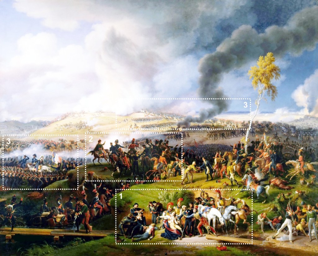 Y las pérdidas, por supuesto, no significan solo muertes, significan heridos, significa los que fueron hechos prisioneros, los que desaparecieron porque desertaron y se fueron. Cuando un ejército napoleónico ha perdido el 20% de sus tropas en un día de batalla, es un ejército aplastado. O mejor dicho, uno de los dos que, habiendo perdido todo esto, decidió huir primero es un ejército aplastado, que durante semanas y meses será imposible volver a poner en combate, porque la moral ha desaparecido y se necesita mucho tiempo antes de reconstruirlo. Por lo tanto, el propósito de una batalla napoleónica es este. Vean aquí la batalla napoleónica. Por supuesto, en el arte occidental hay una convención muy robusta, en el arte occidental clásico. ¿Cómo se representan las batallas? En primer plano o, a lo sumo, en segundo plano, generales a caballo con uniformes brillantes, rodeados de mensajeros, ayudantes de campo, etc. En primer plano algunas escenas de género, los heridos heroicos rodeados de amigos, y en el fondo la batalla real, la que en realidad si hubiéramos estado allí en un helicóptero habría llenado todo nuestro cuadro visual, no el grupo de generales, no la escena de género, sino en el fondo las masas de hombres todos vestidos de igual manera, que se mueven todos juntos, obedeciendo órdenes. Todos se mueven juntos y lo que tienes que tratar de hacer es hacerlos entrar en pánico.