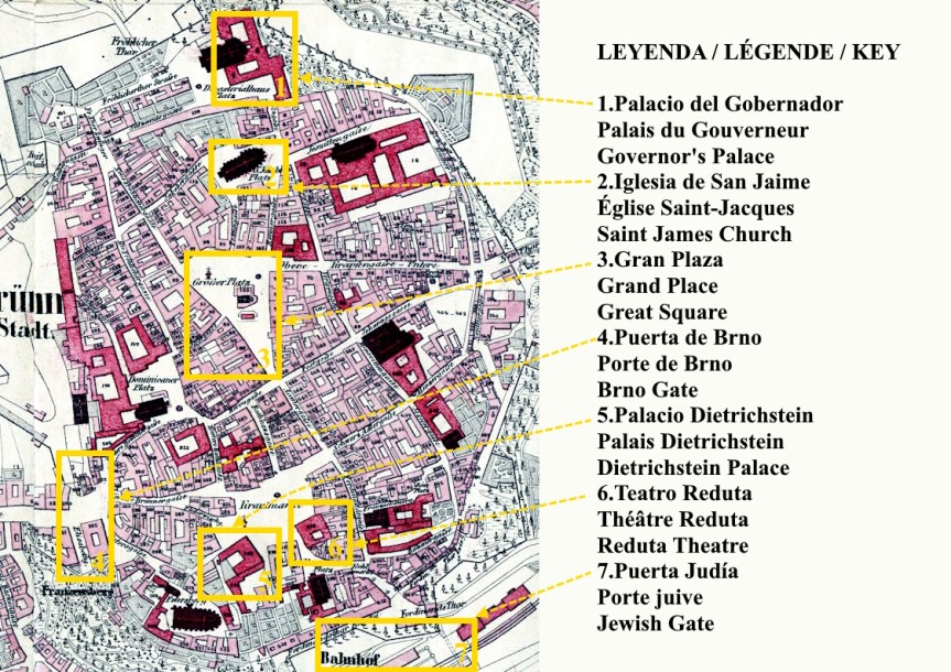 - Durante el reinado del emperador José II, la comunidad agustina fue trasladada a la zona de Staré Brno y el antiguo complejo monástico fue transformado en sede administrativa del gobernador de Moravia. / Sous le règne de l’empereur Joseph II, la communauté augustinienne fut transférée dans le quartier de Staré Brno et l’ancien complexe monastique fut transformé en siège administratif du gouverneur de Moravie. ↩︎